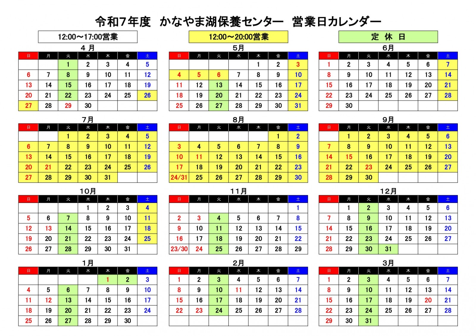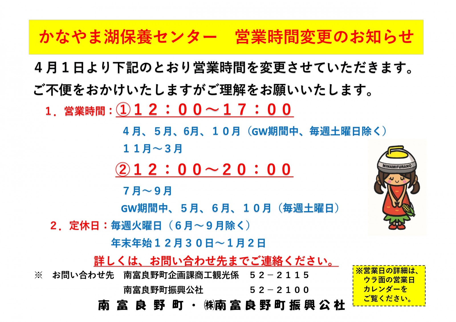 かなやま湖保養センターの営業時間を下記のとおり4月1日(火)より変更いたします。