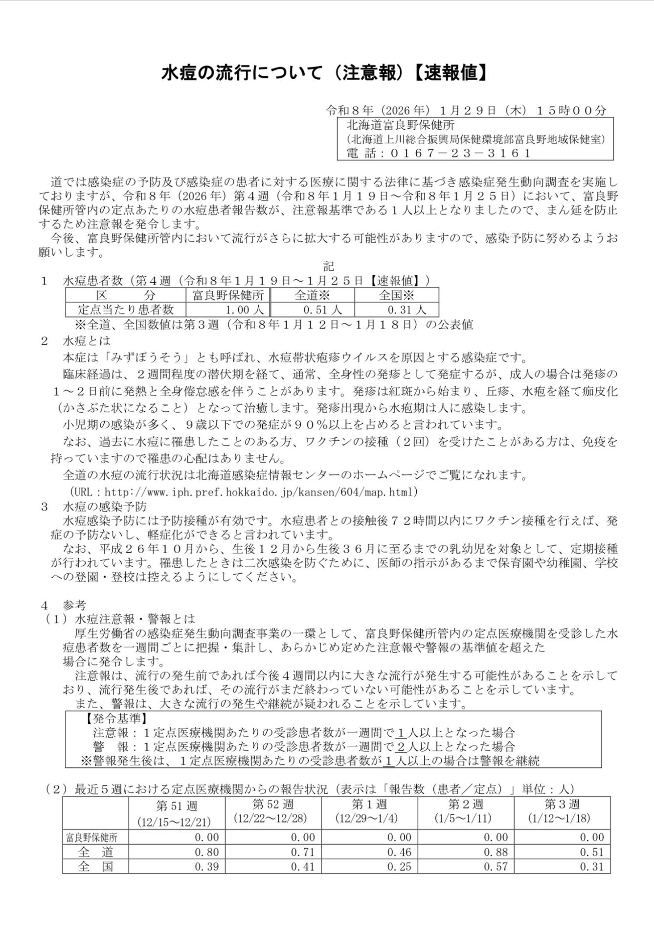 道では感染症の予防及び感染症の患者に対する医療に関する法律に基づき感染症発生動向調査を実施しており、令和8年1月19日~1月25日において、富良野保健所管内の定点あたりの水痘患者報告数が、注意報基準である1人以上となりましたので、まん延を防止するため注意報が富良野保健所より発令されました。