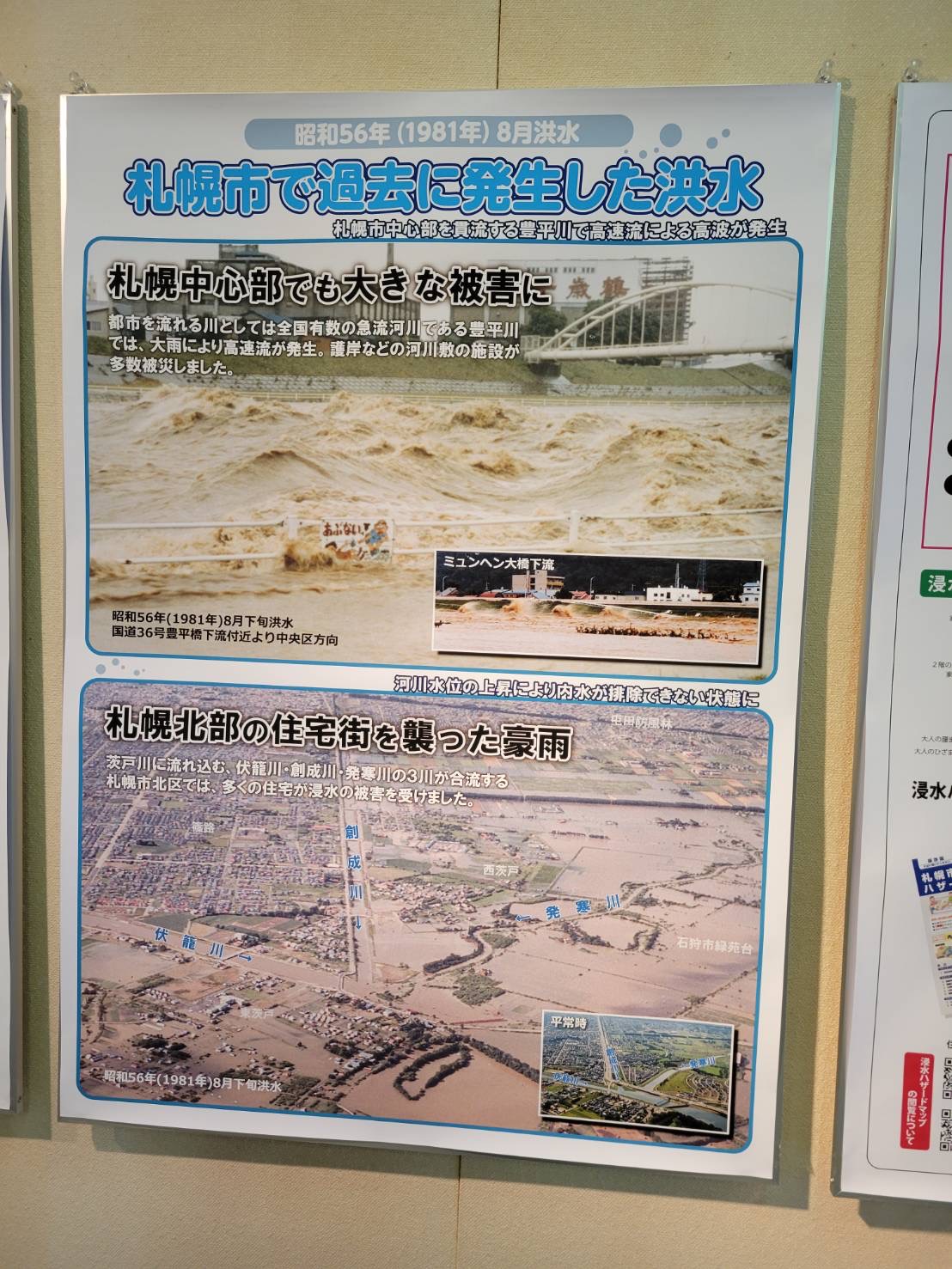 館内には、石狩川治水工事の記録を綴った文書のほか、2016年8月に本町で発生した空知川氾濫による災害について説明しているパネルも展示されていました。