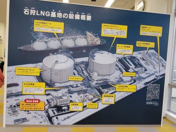 石狩LNG基地は、サハリンやオーストラリアなどの国々から気体の状態でLNGを輸入・貯蔵している北海道唯一の施設だそうです。ここで製造された都市ガスは、タンカーやローリーといったLNG出荷設備を用いて全道各地の貯蔵施設に運搬されています。道央圏にはパイプラインを通じて届けられているそうです。専用の貯蔵タンクひとつひとつに最大40万世帯が1年間使用可能なLNGが貯蔵されており、常時マイナス162°Cに保たれています。マイナス162°Cまで冷却することで液化し、気体時に比べ600分の1の体積に圧縮することが可能となり、効率的な輸送が可能となっているそうです。