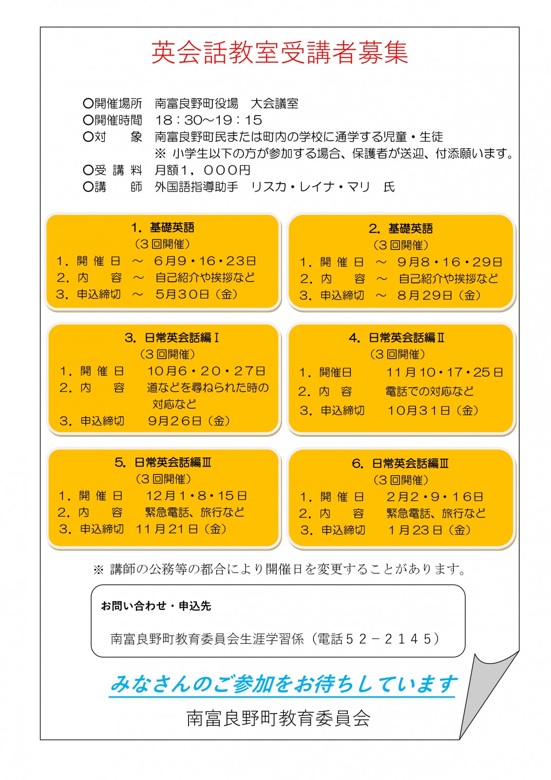 教育委員会生涯学習係では、町民の皆様向けに月3回開講している英会話教室の受講者を募集しております。