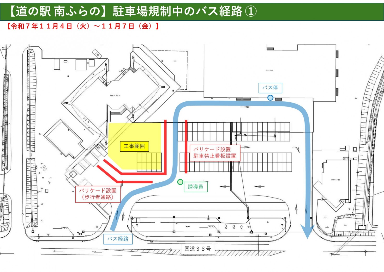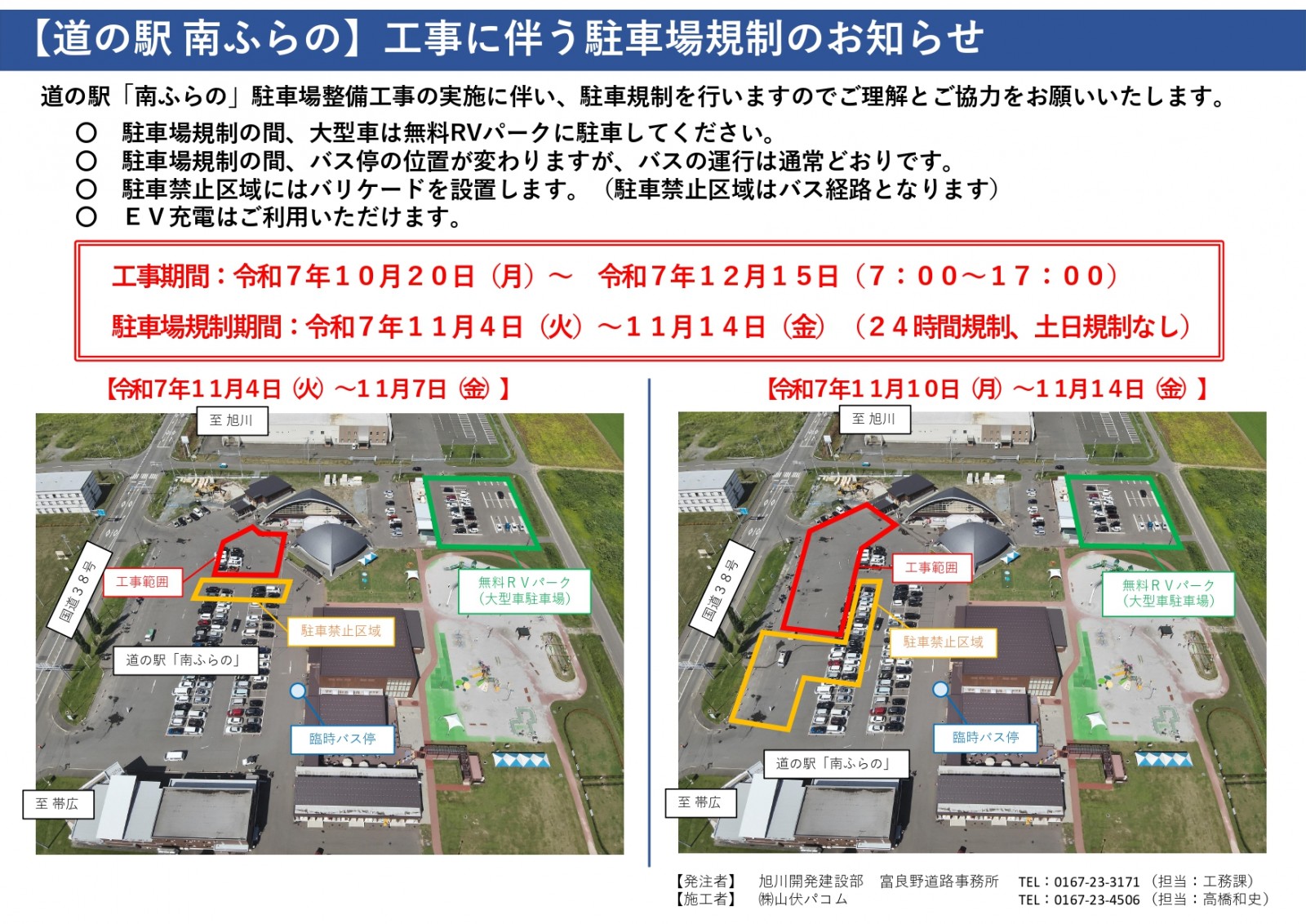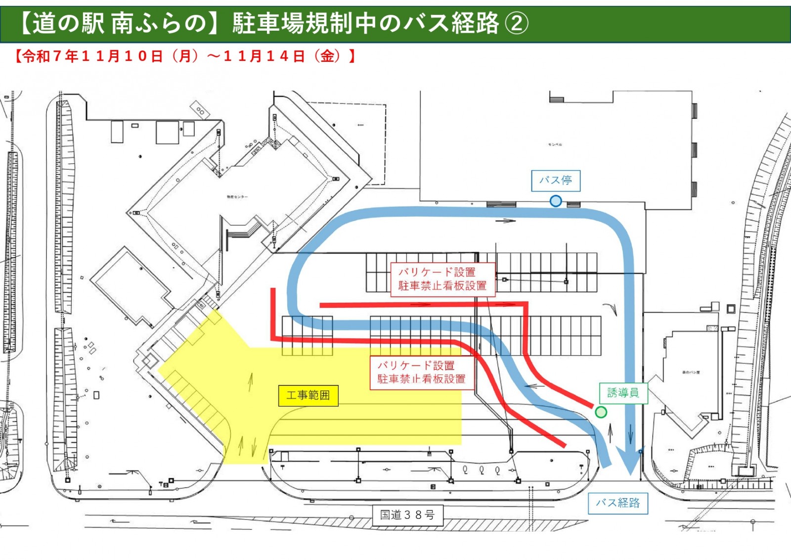 道の駅「南ふらの」駐車場整備工事の実施に伴い、駐車場規制を行いますので、ご理解とご協力をお願いいたします。